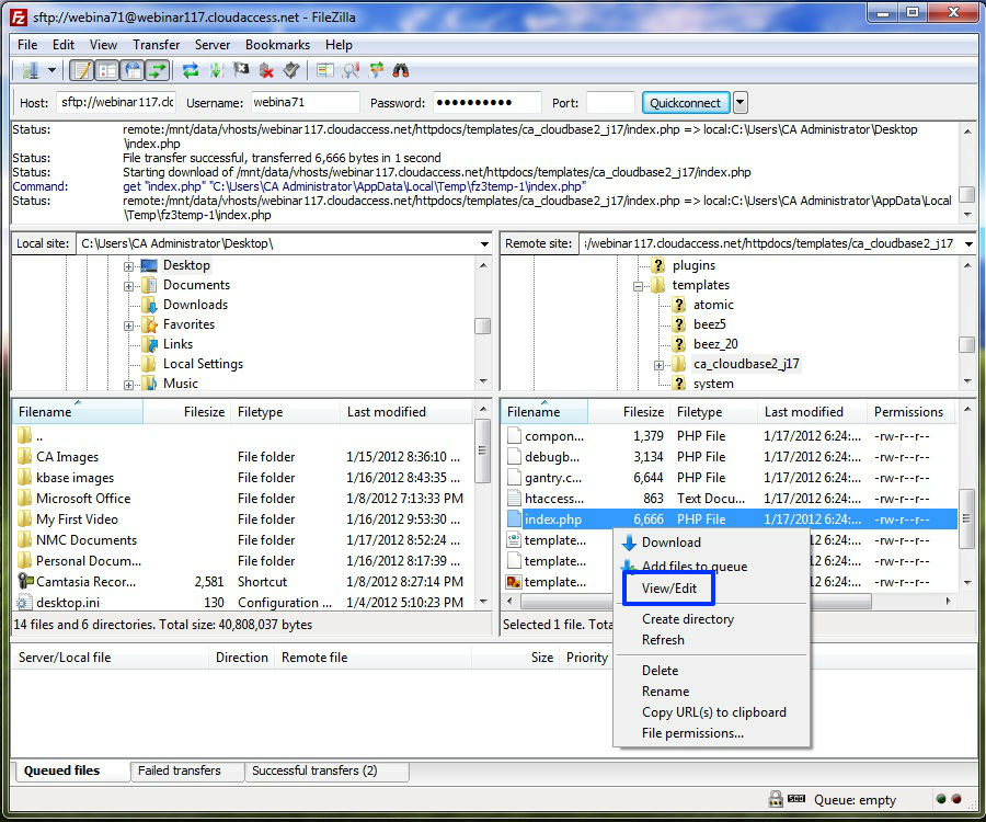 Your index.php file will open in a new window. We highly recommend that you backup this file on your disk before proceeding. Learn how to download a backup of a file using FTP. If you make a mistake, you'll have to have CloudAccess.net run a restore for your site. But, if you make a backup prior to inserting this code, you can just paste the file right back into your site using FTP.