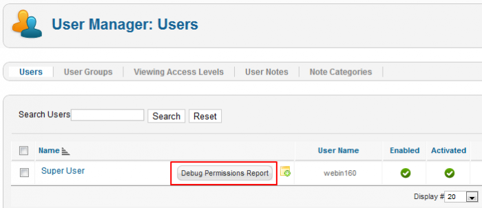 Once inside the User Manager, you ll notice a Debug Permissions Report button next to each User s name.