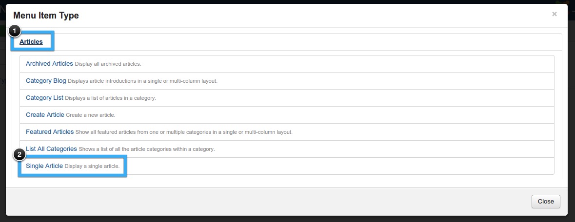There are many useful Menu Item Types and you ll want to learn more about all of them. Select Single Article from the list to continue.